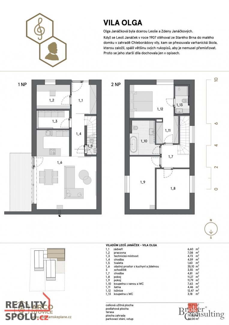 Tato vila s celkovou užitnou plochou 118,86 m² a podlahovou plochou 120,42 m² nabízí rovněž dispozici 5+kk. V přízemí je velkorysý obývací prostor s kuchyní a jídelnou (35,10 m²), pracovna, technická místnost, chodba a toaleta. V patře najdete hlavní ložnici s koupelnou a šatnou, dvě další ložnice, koupelnu s WC a chodbu. Vila má vlastní terasu (12,80 m²), zahradu o velikosti 79 m² a parkovací stání.