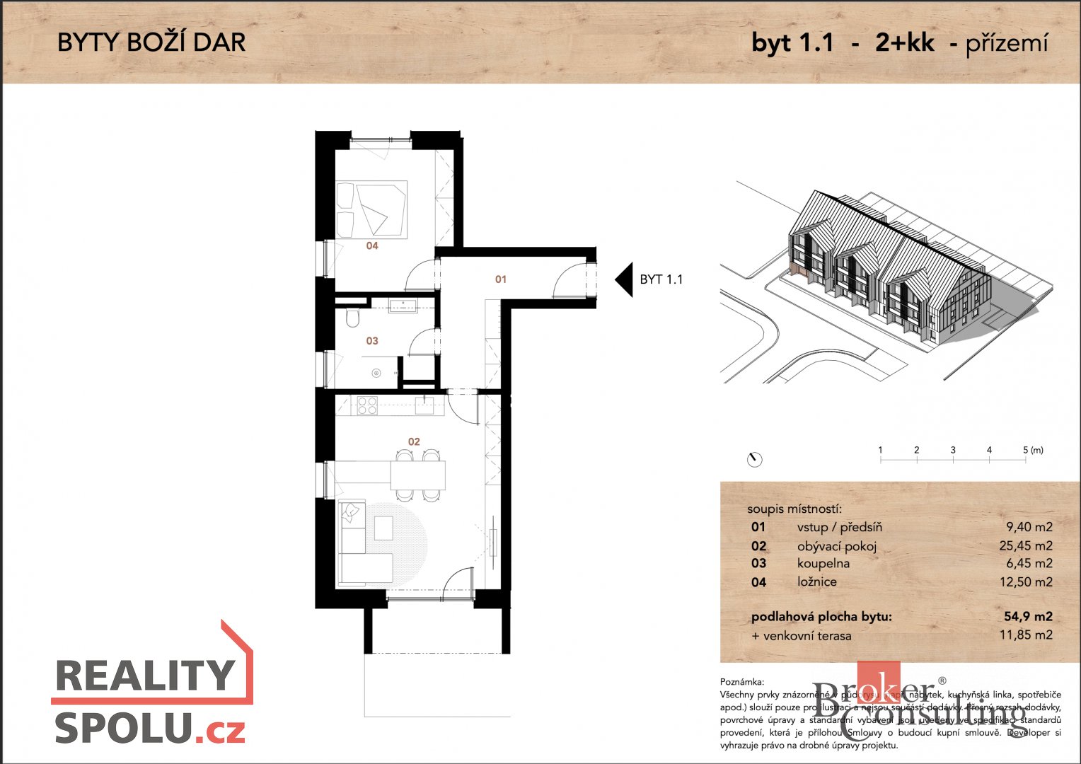 Představujeme Vám projekt byty Boží Dar. Bytový dům je navržen jako moderní rezidenční objekt horského typu o celkovém počtu 18 bytových jednotek, dispozičně řešených ve variantách 2+kk, 3+kk a jedním bytem 4+kk. Přízemní byty jsou koncipovány s vlastními terasami, které přirozeně propojují interiér s okolní krajinou. Každá jednotka disponuje vyhrazeným parkovacím stáním a sklepní kójí, zajišťující dostatek úložného prostoru. Architektonické řešení vychází z horského charakteru lokality - design kombinuje moderní prvky s přírodními materiály a vytváří tak bydlení, které je funkční, estetické a respektuje své prostředí.Nabízený byt: 1.1. dispozičně řešen 2+kk s celkovou plochou 71m2, která se skládá z terasy 11,85m2 a sklepní koje 4,4m2. Další byty v nabídce na webu realitybozidar